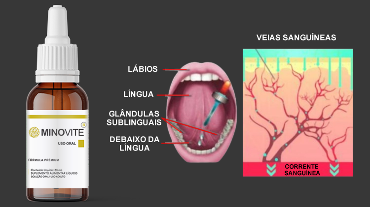 A forma de usar o MinoVite é sublingual, debaixo da língua, onde tem vasos que levam direto para o sangue.